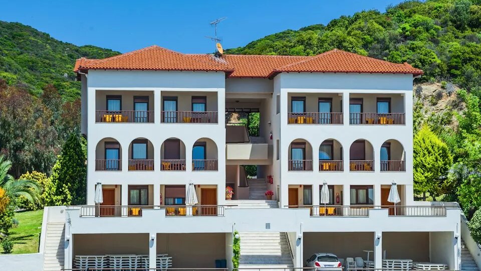 LOKACIJA: samo 5km pre Uranopolisa, sa kojim je povezan hotelskim kombijem oko dvestotine metara od sopstvene plaže (prolaz ispod puta), nalazi se ovaj izuzetno lep i konforan hotel, renoviran 2007. godine. Sastoji se iz desetak manjih objekata sa smeštajnim jedinicama od kojih većina ima pogled na more i ostrva arhipelaga Amuliani. Odlična hrana, ljubazno osoblje, izuzetan menadžment, učiniće Vaš odmor u ovom hotelu nezaboravnim.