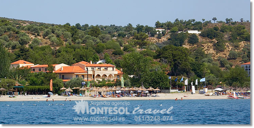 LOKACIJA: 2 km od glavne luke Tasos-Limenas, u bujnoj borovoj šumi koja se stepenasto spušta ka moru. Luksuzni kompleks hotela i bungalova smešten je uz najpoznatiju plažu na Tasosu-Makryammos.