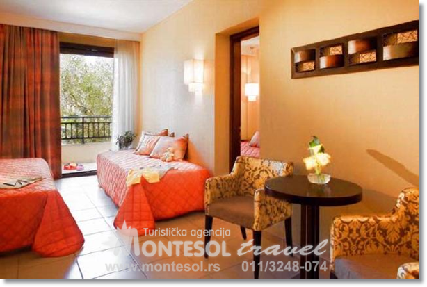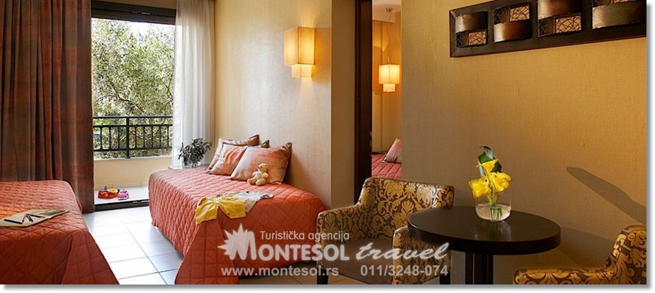 Family superior sobe: oko 40m2, imaju dve odvojene sobe, udaljenost od plaže je do 100m, opremljene su u minimalističkom–Skandinavskom stilu, imaju pogled na zaliv, mali bazen i more. SADRŽAJ/USLUGE: recepcija, restorani, taverna na plaži, bazen, dečiji bazen, igralište za decu, mini klub, teretana, aerobik, bilijar, teniski teren, stoni tenis, teren za košarku i odbojku na plaži, parking.