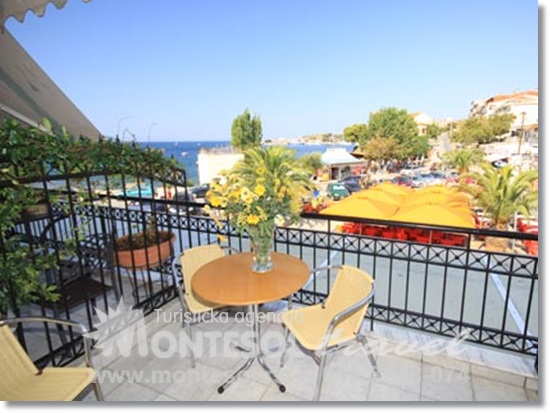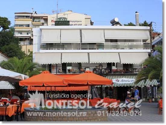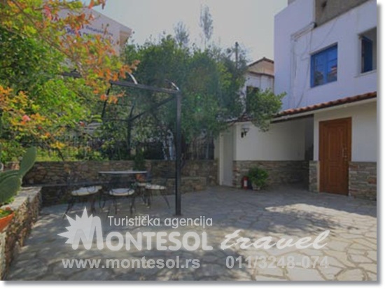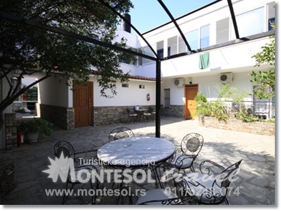 Nalazi se u centru grada kod fontane, na samoj obali mora. Udaljena je od glavne plaže oko 400 m. Sa unutrašnje strane kuće je lepo uredjeno dvorište - vrt. Svi studiji se nalaze u parteru i na 1. spratu. Studiji su 1/2 (jedan francuski ležaj), 1/3 (jedan francuski ležaj i jedan klasičan ležaj) i 1/3+1 (jedan francuski ležaj, jedan klasičan ležaj iz koga se izvlači još jedan ležaj). Prostrani su, sa terasom koja ima garnituru za sedenje i tendu, vrata i prozori imaju roletne, kupatilo (tuš kada,WC, lavabo sa ogledalom), kuhinja (kompletno opremljena sa posuđem, dve ringle, frižider), TV i A/C (čije je korišćenje uključeno u cenu), jedan peškir po osobi. Promena posteljine i peškira vrši se na 5 dana. Gostima je na raspolaganju WI-FI internet (agencija nije odgovorna za kvalitet i brzinu). Skoro sve terase gledaju na more.
