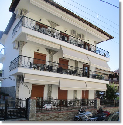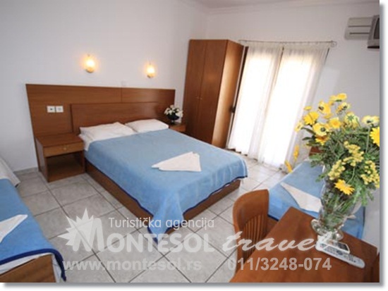 Nalazi se u blizini glavne plaže, na oko 250 m udaljenosti. Većina studija i apartmana gleda ili na luku ili na plažu prema Porto Carrasu. Vila poseduje 1/3 studije, 1/4 studije i 1/4 apartmane. Trokrevetni studio sadrži jedan francuski ležaj i jedan klasičan ležaj, četvorokrevetni studio i apartman sadrže jedan francuski ležaj i dva klasična ležaja. Sve smeštajne jedinice imaju  terasu sa tendom (roletne na prozorima i vratima), garniturom za sedenje, kupatilom (tuš kada, lavabo sa ogledalom,WC),  kompletno opremljenom kuhinjom (kuhinjski elementi se zatvaraju roletnom) dve ringle, frižider, TV, AC (korišćenje klime uključeno u cenu), jedan peškir po osobi. Promena posteljine i peškira vrši se na 5 dana. Gostima je na raspolaganju WI-FI internet (agencija nije odgovorna za kvalitet i brzinu).