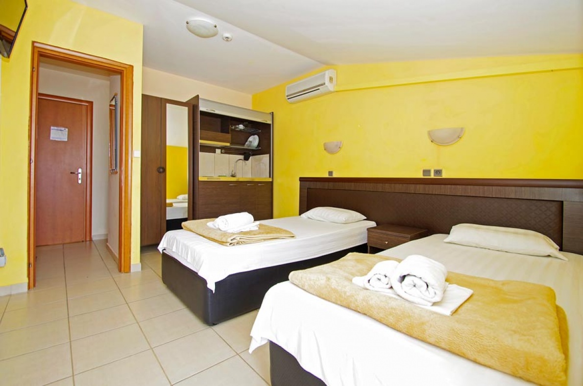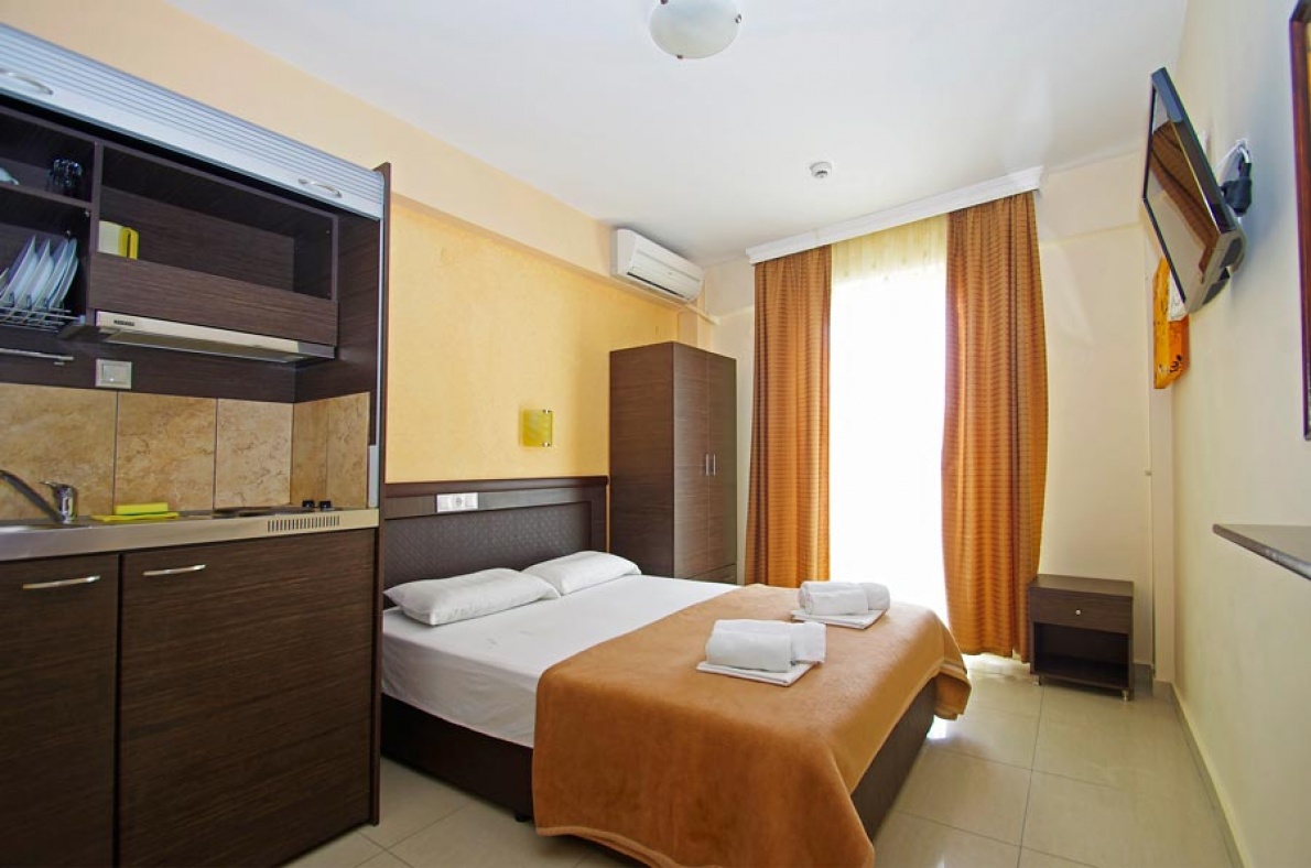 Hotel apartmanskog tipa, nalazi se na oko 150m od plaže. Hotel raspolaže dvokrevetnim, trokrevetnim i četvorokrevetnim studijima, koji sadrže kompletno opremljenu kuhinju, twc, klima uređaj (uz doplatu 7 dnevno), TV, peškire, terasu. Promena posteljine i peškira je na 5 dana. SADRŽAJ hotela: recepcija, restoran, bar, lift i besplatno korišćenje interneta. Takođe poseduje posebnu rampu i twc za goste sa posebnim potrebama u kolicima.