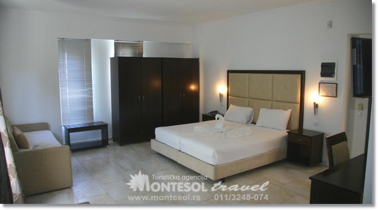 Apartmani: veoma prostrani, sastoje se iz spavaće i dnevne sobe, opremljene kuhinje, kupatila, balkona ili terase. Moguće je smestiti i do 5 osoba.
