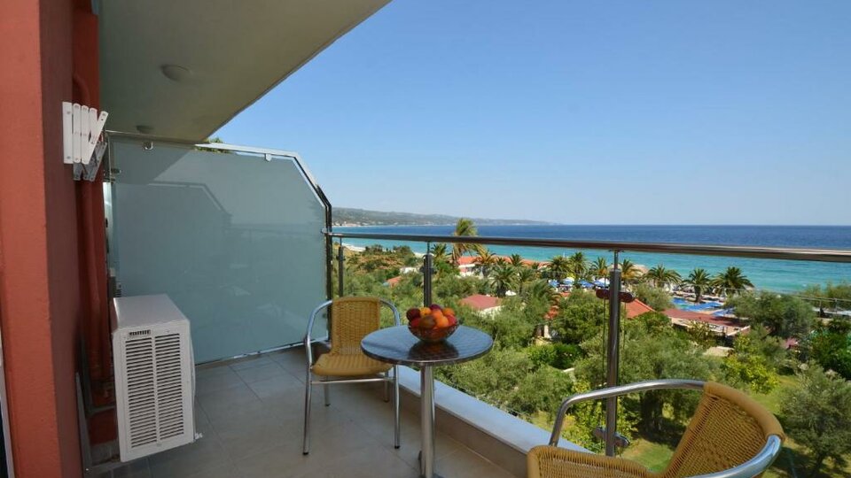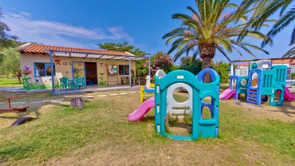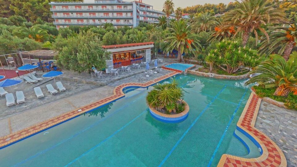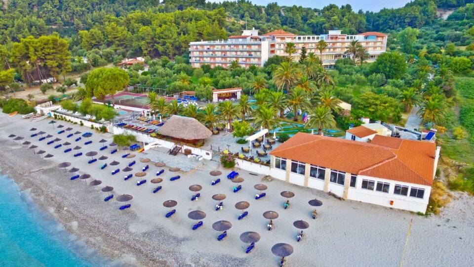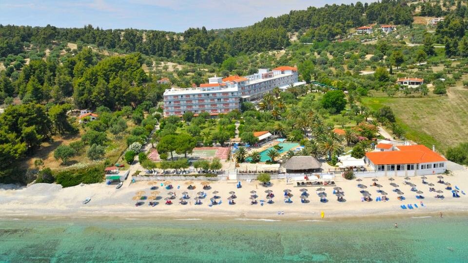 Smešten je na peščanoj plaži koja poseduje plavu zastavu, okružena borovom šumom. Samo dvorište hotela je lepo uredjeno, sa travnatim površinama, maslinovim stablima i tropskim rastinjem. Ležaljke i suncobrani na plaži se dodatno plaćaju (po povoljnoj ceni), dok su oko bazena besplatni.